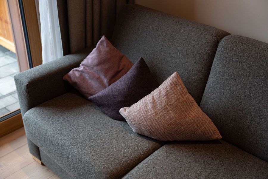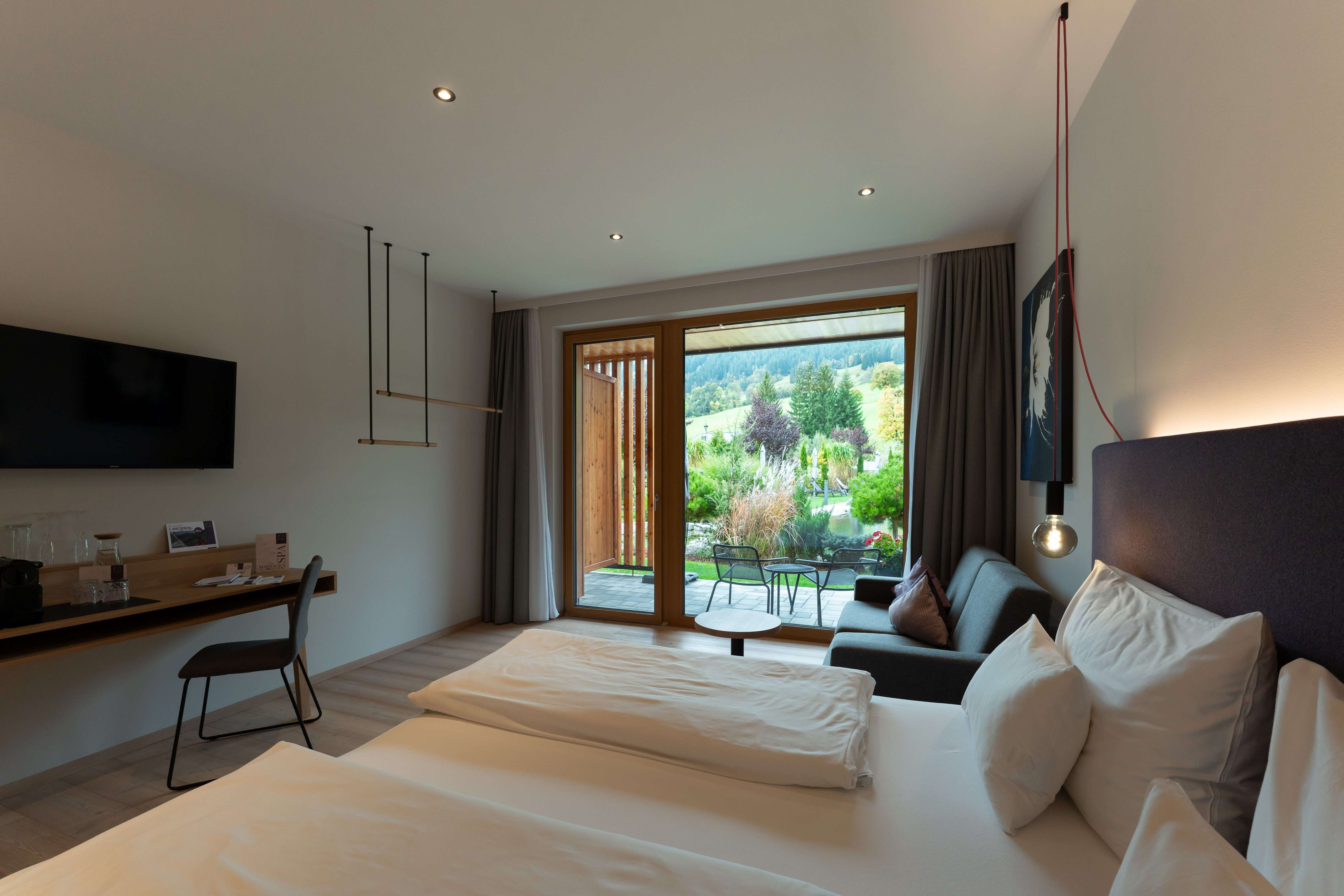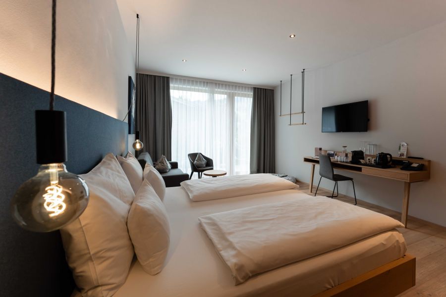 Unsere großzügigen Doppelzimmer „FreiRaum“ (30m²) sind sowohl bei Paaren als auch bei Familien sehr beliebt. Sie bieten Platz für bis zu 3 Personen und gewährleisten eine erholsame Nachtruhe. Das Boxspringbett mit getrennten Matratzen sorgt für einen ruhigen Schlaf, während eine hochwertige Schlafcouch zusätzlichen Komfort bietet. Das Badezimmer ist mit einer Regendusche, Handtuchtrockner, Föhn und Toilettenartikeln ausgestattet und bietet den idealen Raum für einen entspannten Start in den Tag. Die Zimmer befinden sich ebenerdig und verfügen über eine eigene Terrasse, die zum Verweilen im Freien einlädt.