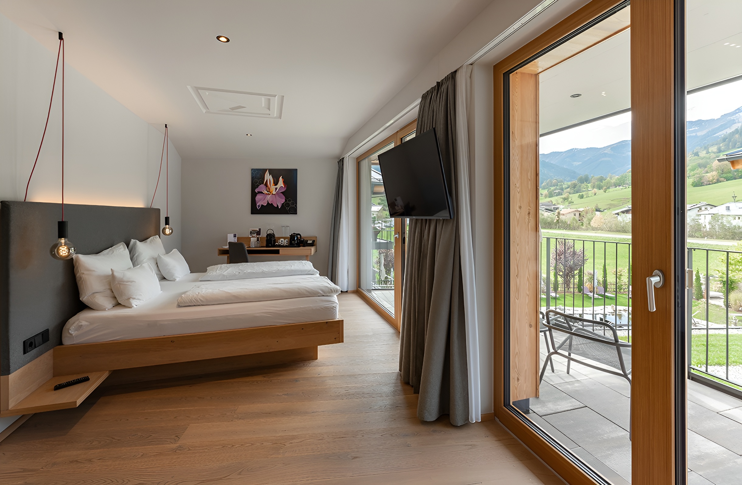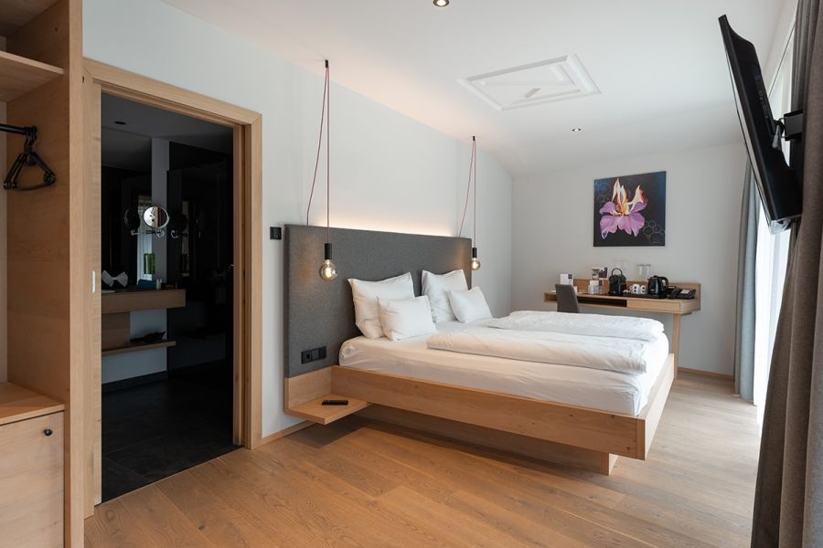 Our Double Rooms “LebensFreude” offer pure relaxation. Whether traveling alone or as a couple, this double room provides plenty of space. The large box-spring bed with separate mattresses ensures a restful sleep and lets you start the new day feeling refreshed. The bathroom, with a view through the living-sleeping area into nature, creates the perfect space to begin your day feeling fresh and happy. From the panoramic balcony, you can enjoy stunning views of the garden and the natural pool, as well as meadows, forests, and mountains in Maria Alm.