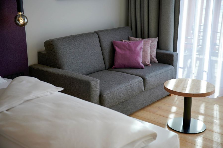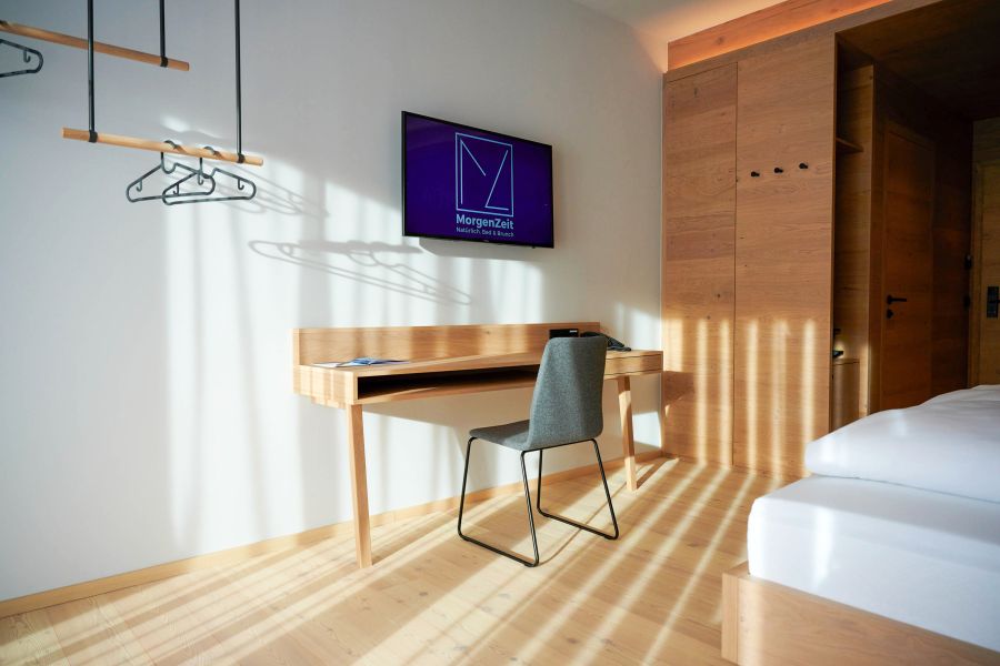 Our spacious Double Room Glücksgefühl is very popular with both couples and families. Here, up to 2 guests can enjoy a restful sleep and comfortable accommodation. A large box-spring bed with separate mattresses ensures peaceful sleep, and the high-quality armchair adds extra comfort. From the balcony, you can enjoy a breathtaking mountain view, making your stay even more memorable. The bathroom, with a rain shower, towel warmer, hairdryer, and toiletries, is the perfect place to refresh yourself in the morning and start your day off right.